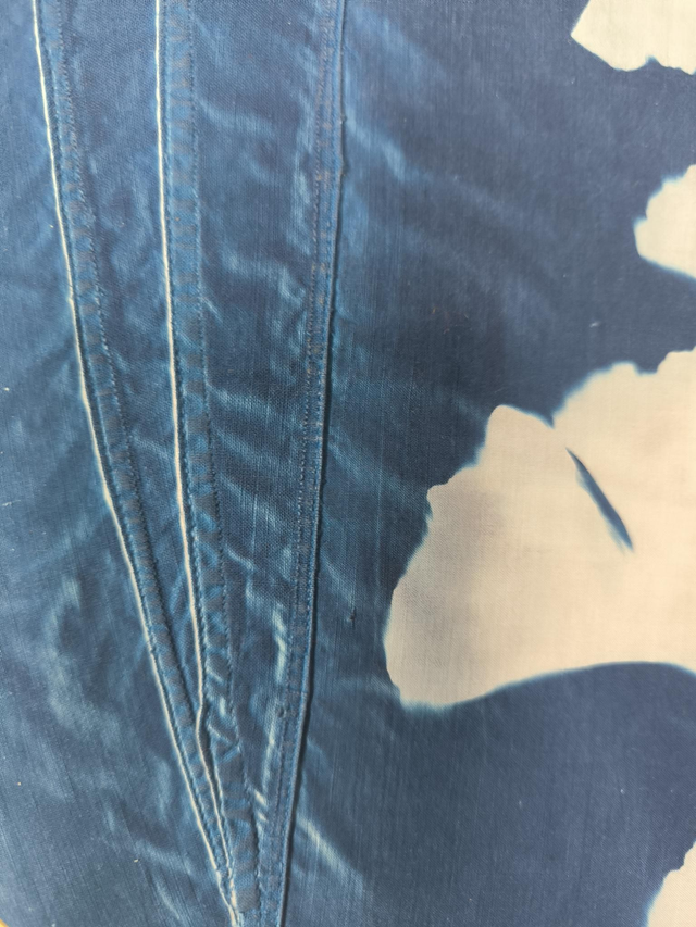 Sur drap ancien cyanotypé, tendu sur un cercle à broder en bois, diamètre 25cm.